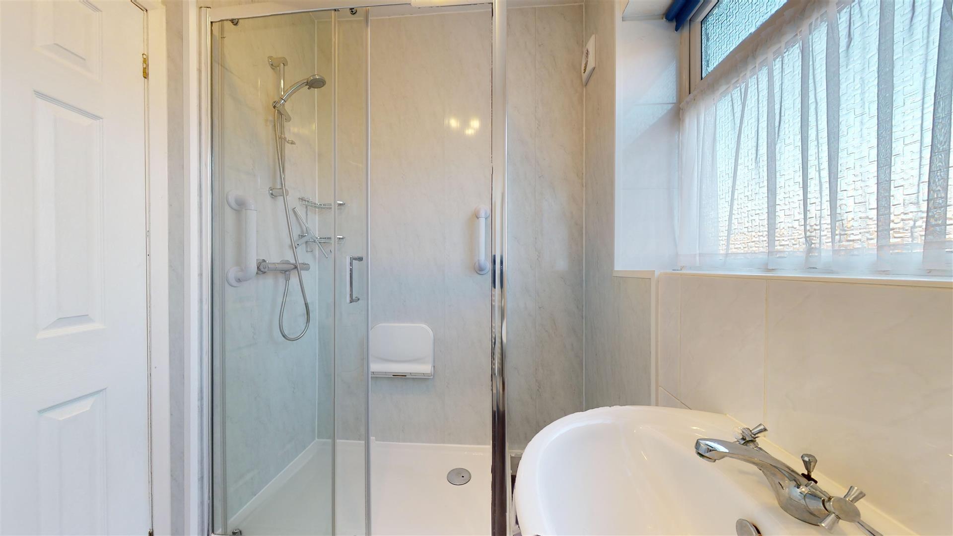 White suite comprising corner cubicle with glazed screen and shower, pedestal wash basin and WC. Part lined walls to a stone-effect finish with ceramic tiling in part, double glazed window and a white enamelled towel radiator.