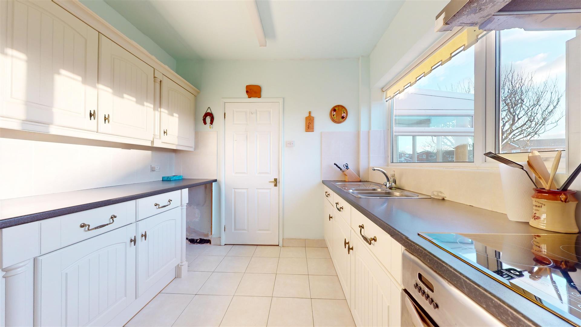 Fitted base and wall units with roll edge working surface to include an inset single drainer sink, void and plumbing for washing machine, attractive tiled splashback, stone-effect ceramic tiled flooring, panelled radiator and door opening to the rear garden.