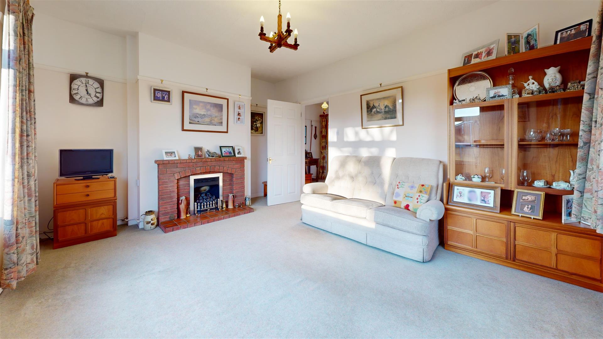 An attractive and well lit room with large picture window overlooking the south westerly facing rear garden together with a further double glazed window to gable, feature brick fireplace and heather brown topped tiled hearth with a coal-effect Living Flame gas fire, TV point, picture rail and double panelled radiator.
