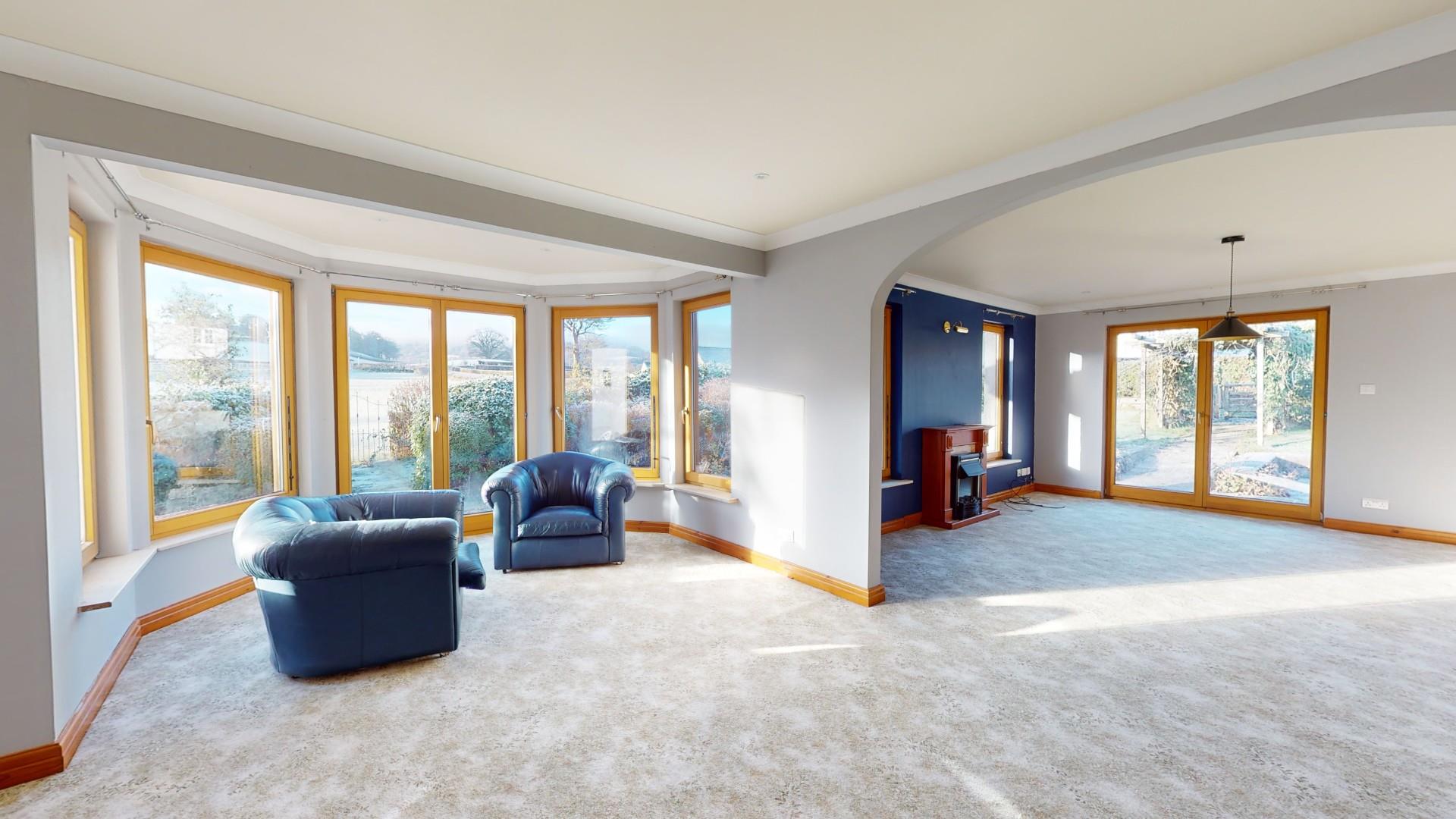 A splendid room with a deep splayed window with three-quarter depth picture windows and twin glazed doors opening out with a pleasing aspect in a westerly direction over the gardens and adjoining farmland. Coved ceiling, downlighters and wide archway to adjoining lounge.