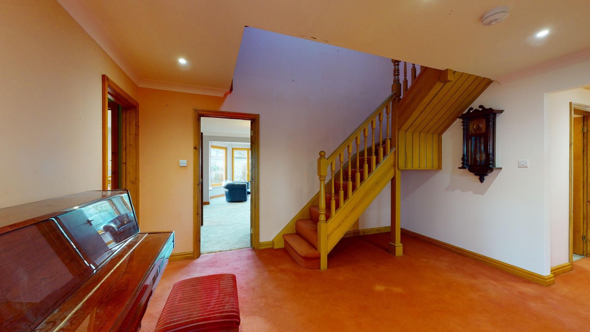 With a fine hardwood staircase rising off with turned spindles and gallery over, ceiling downlighters, coved ceiling, wall light points and fitted cloaks cupboard. Glazed and panelled door leading to the dining room.