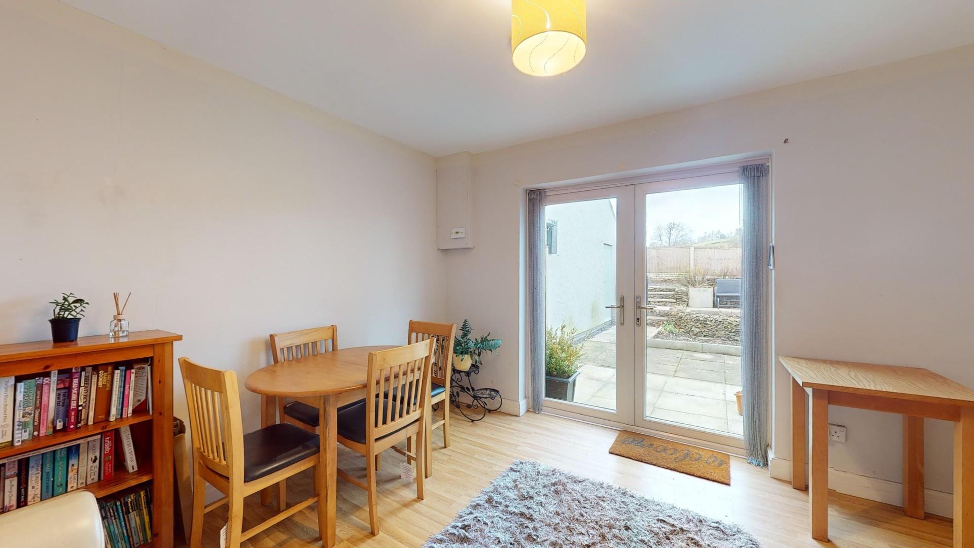 A well lit room with modern UPVC double glazed patio doors opening to a private and west facing garden with views across rolling countryside. Woodgrain effect floor finish, panelled radiator.