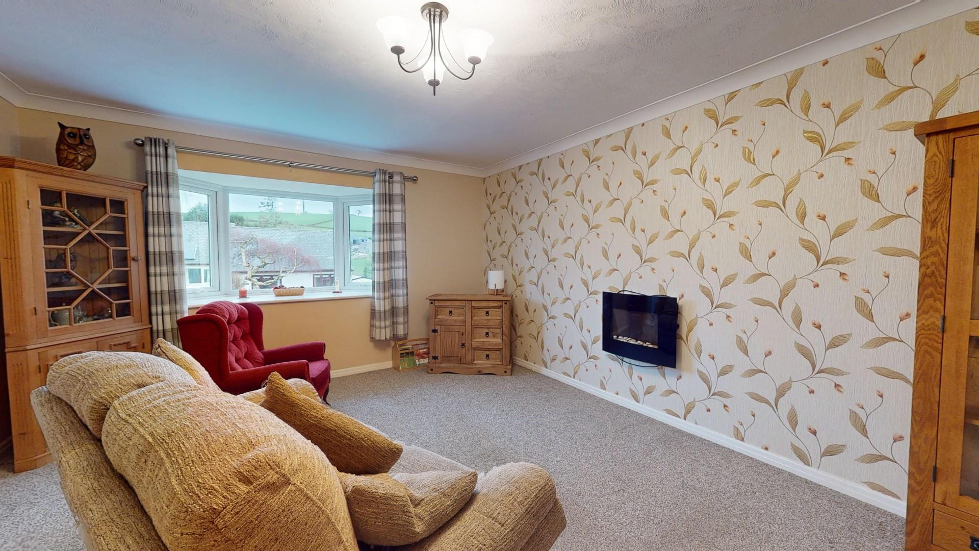 A spacious room with a deep double glazed bow window to front with views across the cul de sac towards rolling countryside and beyond the Berwyn Hills, coved ceiling, wall mounted pebble effect electric fire, TV point, panelled radiator.