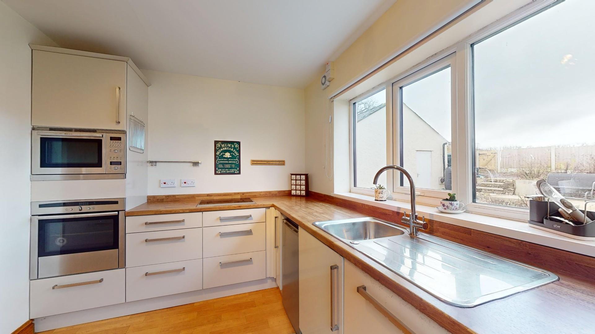 Refurbished with a contemporary range of base and wall mounted cupboards and drawers with an off white finish to door and drawer fronts and contrasting woodgrain effect working surfaces to include an inset single drainer sink with mixer tap, inset Neff four ring electric hob together with built in Neff oven and microwave, space for fridge, integrated AEG dishwasher, large pan drawers, small breakfast bar, extractor fan, double glazed windows with far reaching westerly views, panelled radiator, double glazed door to side.