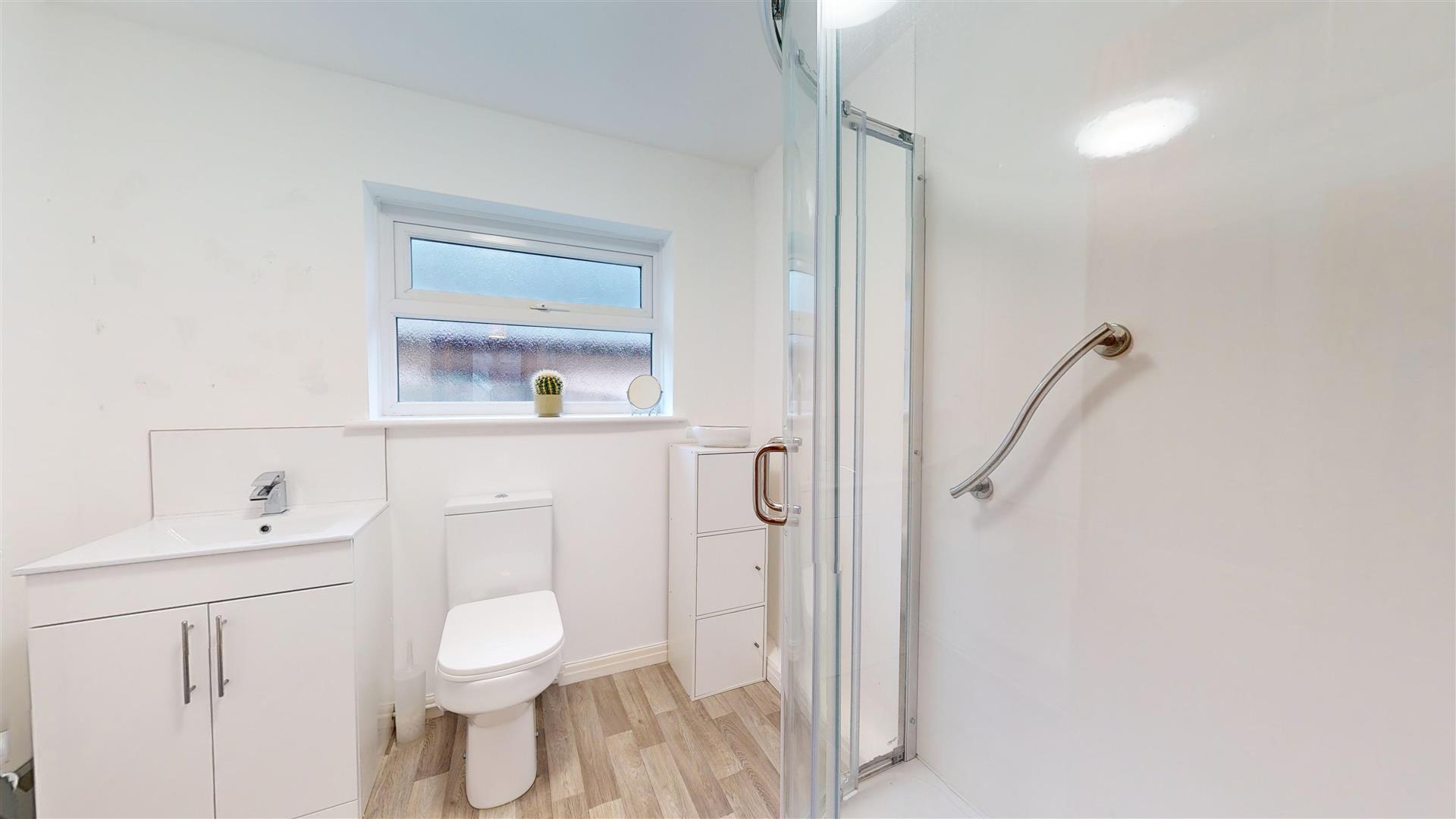 Refurbished with a modern white suite comprising large corner cubicle with glazed screen and electric shower, vanity with bowl and storage cupboard, low level WC, extractor fan, woodgrain effect floor finish, double glazed window, panelled radiator.
