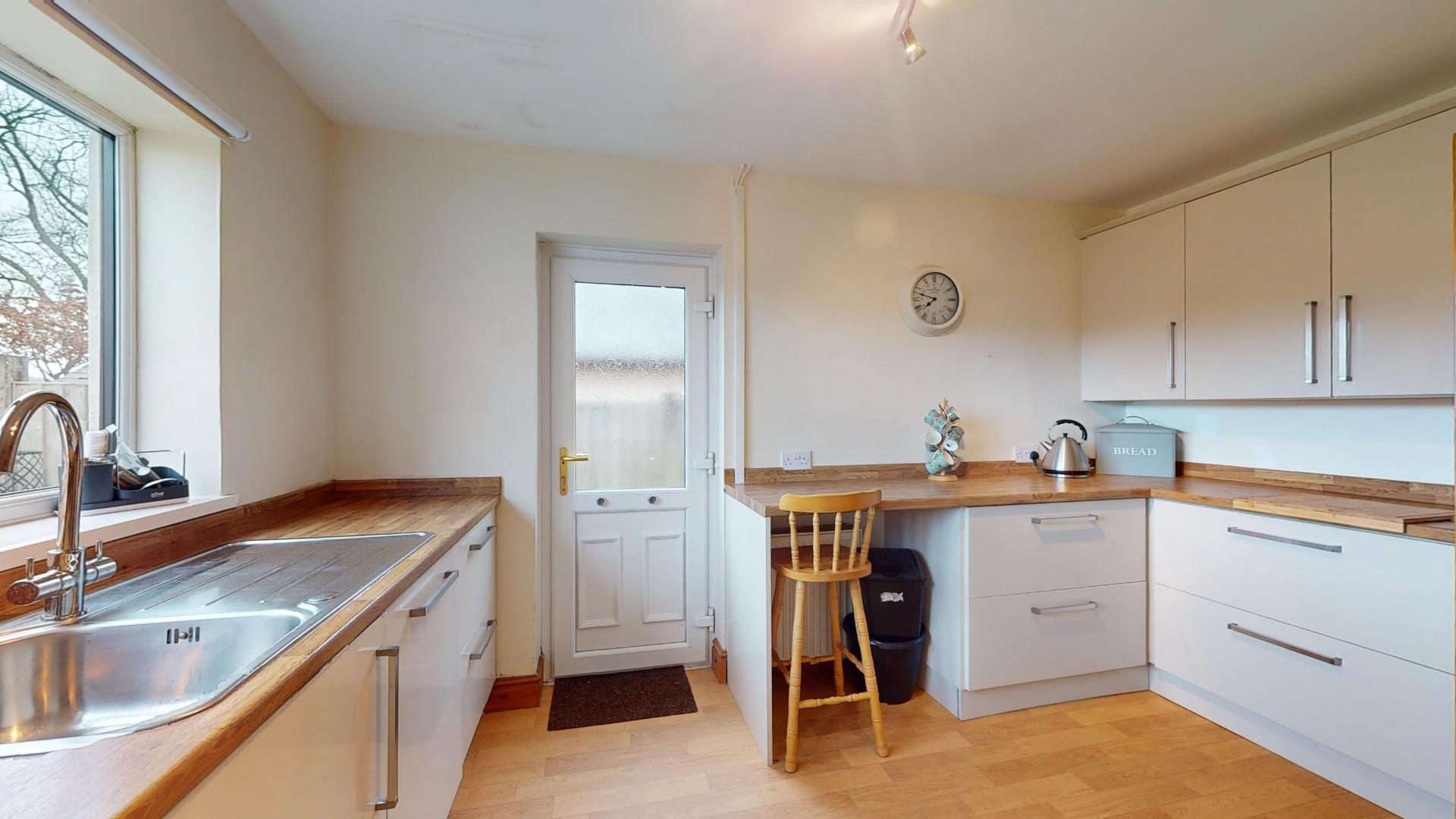 Refurbished with a contemporary range of base and wall mounted cupboards and drawers with an off white finish to door and drawer fronts and contrasting woodgrain effect working surfaces to include an inset single drainer sink with mixer tap, inset Neff four ring electric hob together with built in Neff oven and microwave, space for fridge, integrated AEG dishwasher, large pan drawers, small breakfast bar, extractor fan, double glazed windows with far reaching westerly views, panelled radiator, double glazed door to side.