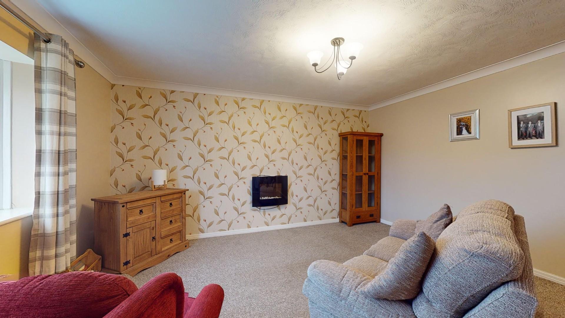 A spacious room with a deep double glazed bow window to front with views across the cul de sac towards rolling countryside and beyond the Berwyn Hills, coved ceiling, wall mounted pebble effect electric fire, TV point, panelled radiator.
