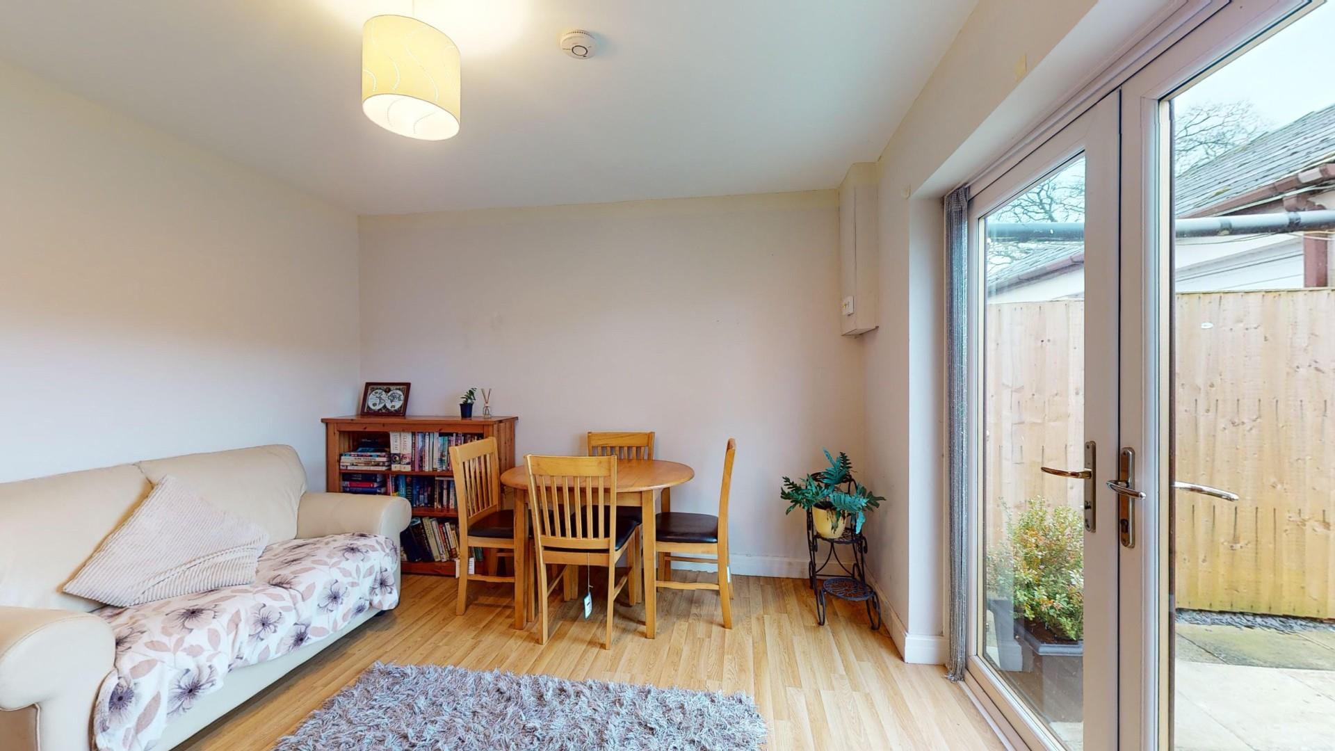 A well lit room with modern UPVC double glazed patio doors opening to a private and west facing garden with views across rolling countryside. Woodgrain effect floor finish, panelled radiator.