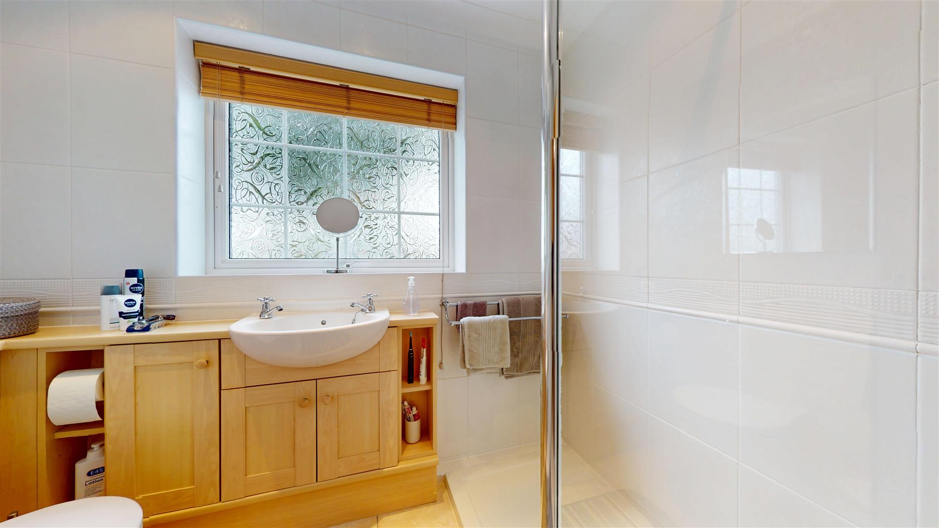Refurbished with a modern white suite comprising a large floor level shower tray with glazed screen and high output shower with monsoon style head, fitted cabinet incorporating wash basin and WC, double glazed window, ceiling downlighters, tiled floor, chrome towel radiator.