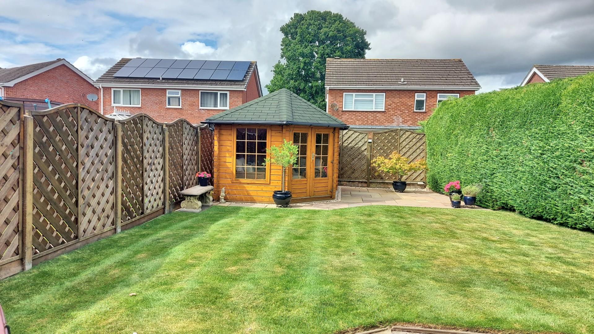 A timber decked area extends round to the rear elevation of the house with inset lighting and a modern four person hot tub included in the sale. Beyond there is a lawn together with a further riven stone flagged patio which adjoins the large timber framed and panelled summerhouse (2.7m x 2.96m overall) with twin panelled doors in, electric light and power installed and a further enclosed store shed for garden equipment to rear (2.96m x 1.35m)